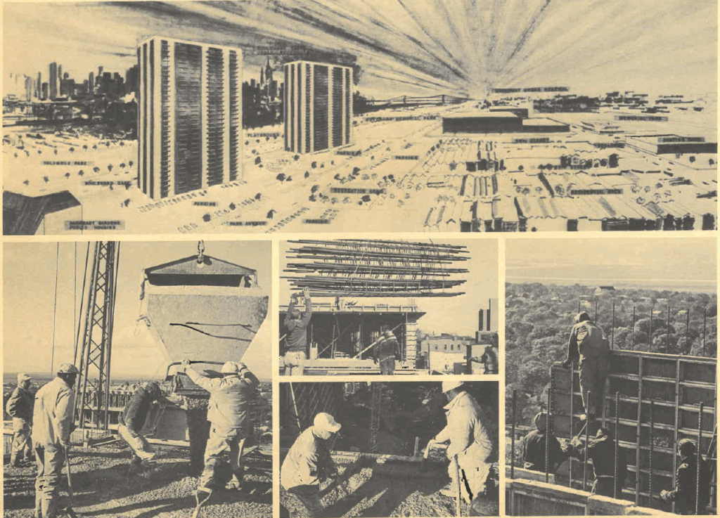 The construction of the all reinforced concrete foundation and superstructure of twin 26-story tower apartment buildings and overpass to parks and recreational facilities on the river side of Boulevard East.
